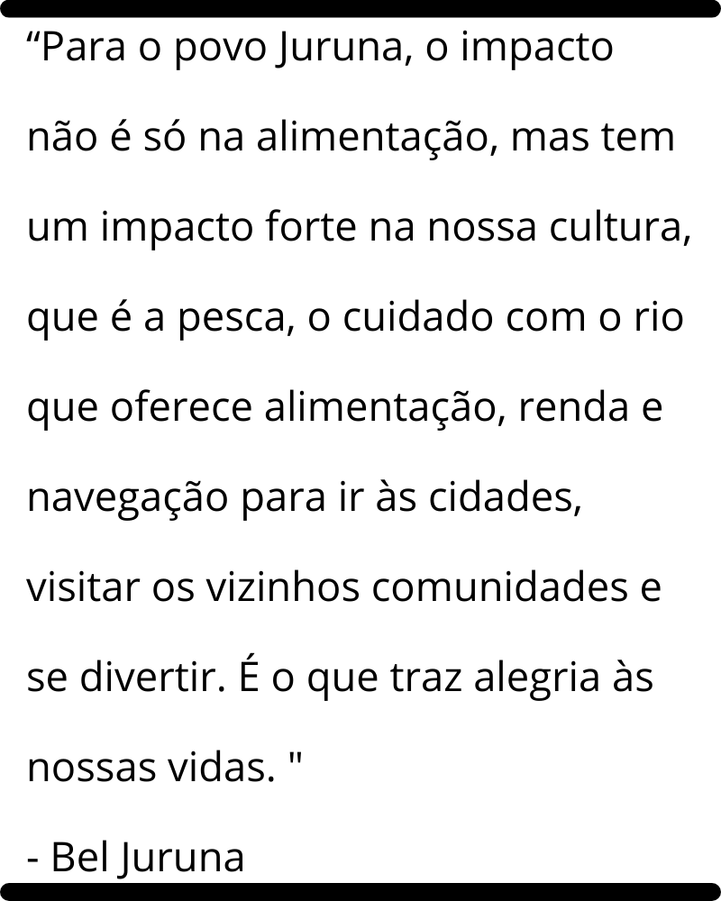 “Para o povo Juruna, o impacto não é só na alimentação, mas tem um impacto forte na nossa cultura, que é a pesca, o cuidado com o rio que oferece alimentação, renda e navegação para ir às cidades, visitar os vizinhos comunidades e se divertir. É o que traz alegria às nossas vidas ”, disse Bel Juruna.