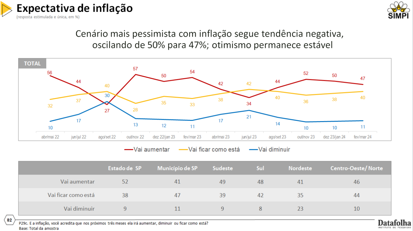 O cenário segue pessimista referente à inflação, oscilando de 50% que afirmaram que vai aumentar para 47%, o otimismo permanece estável, 11% afirma que vai diminuir. No recorte o Estado de São Paulo é o mais pessimista, mais da metade (52%) acredita que a inflação vai aumentar. A expectativa sobre o poder de compra segue a tendência da inflação, e 45% esperam queda no poder de compra nos próximos meses.