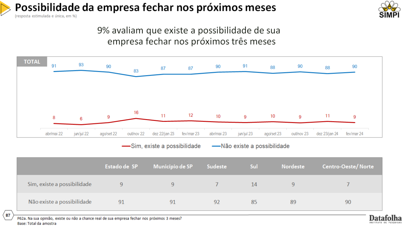 Outro dado que se destaca, mesmo diante de cenários desafiadores em relação a custos, juros, mão de obra e insumos, é que 90% das empresas declaram que não há possibilidade de encerrarem suas atividades nos próximos três meses . Na região Sul, entretanto, esse dado é um pouco mais pessimista, com 14% das empresas declarando que existe a possibilidade de fecharem o negócio.