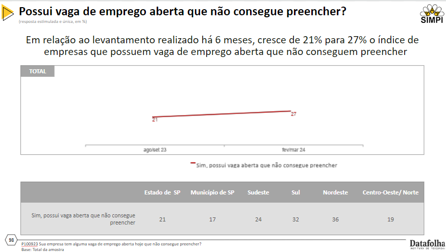 Além disso, aproximadamente uma em cada cinco empresas (27%) possui vagas de emprego abertas que não consegue preencher. Esse índice é superior ao registrado entre agosto e setembro do ano passado (21%). A falta de capacitação da mão de obra disponível no mercado é apontada como a principal dificuldade para contratação, seguida pela escassez de pessoas disponíveis no mercado de trabalho.