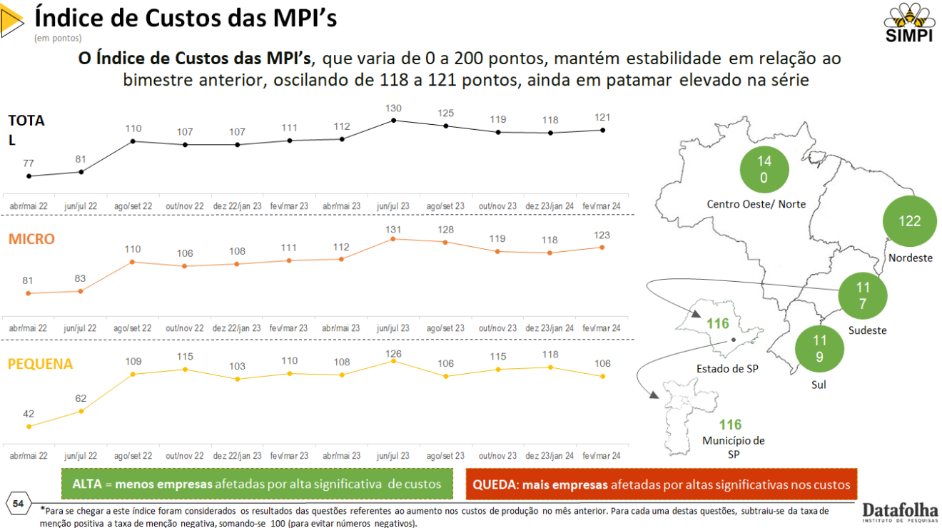 O Índice de Custos das MPI’s mantém a estabilidade em relação ao bimestre anterior, oscilando de 118 a 121 pontos, ainda em patamar elevado. O índice varia de 0 a 200 pontos, sendo que quanto maior o número menos empresas são afetadas por alta significativa de custos. No mês anterior a pesquisa, 38% das empresas relatam ter sofrido com altas significativas nos custos da produção, principalmente em matéria-prima e insumos (25%)
