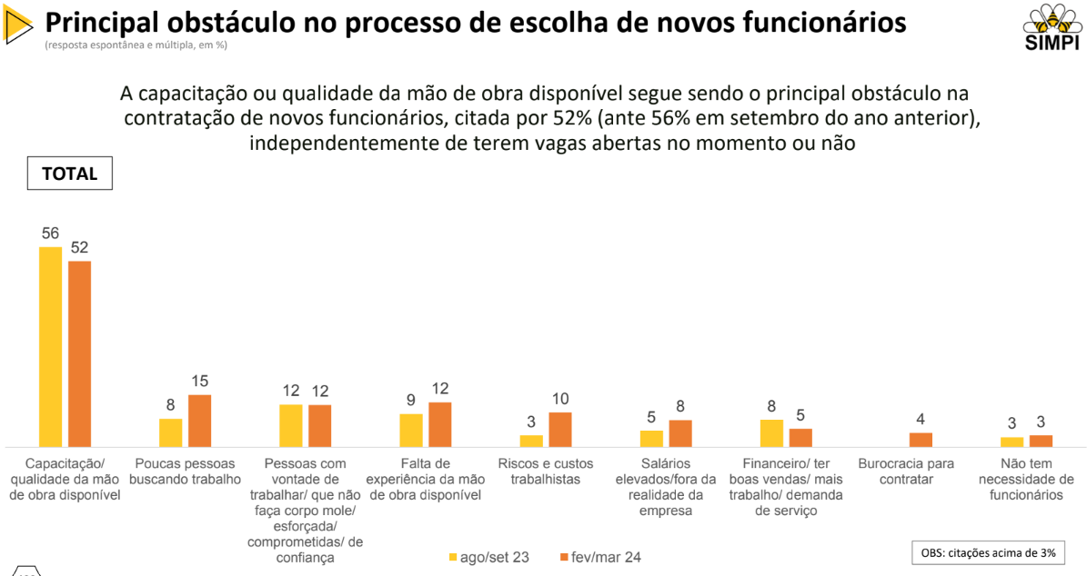 64% das empresas com vagas abertas enfrentam a falta de candidatos qualificados como o principal desafio, seguido por 24% que mencionam o baixo número de pessoas procurando emprego .
